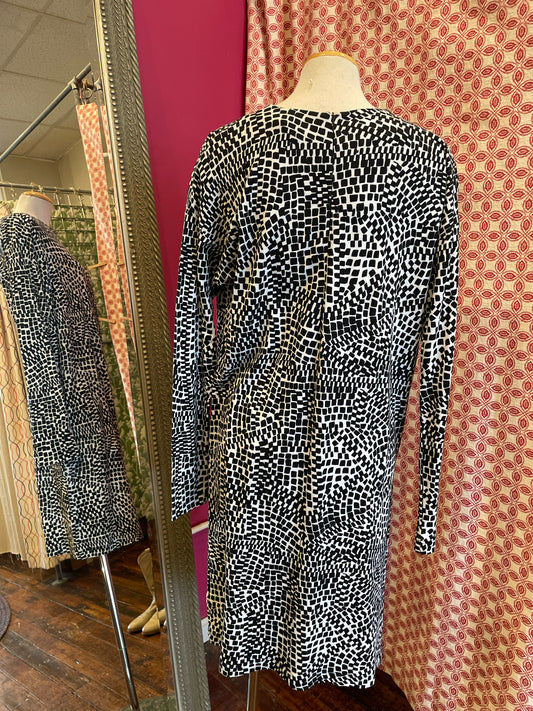 Black and white geometric patterned long-sleeved midi dress