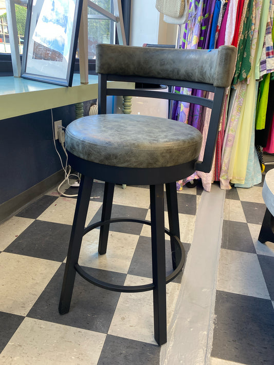 Barstool with dark gray leather seat and black metal frame