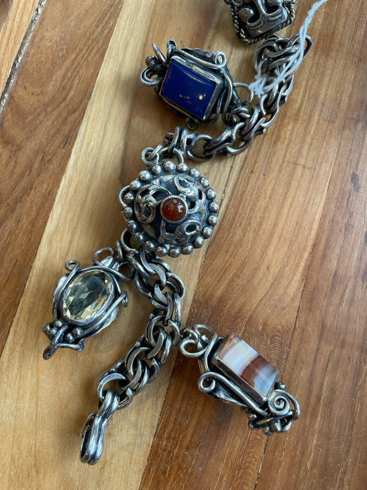 INSANE 800 coin silver antique Italian charm bracelet, each charm has a semi-precious stone incorporated, featuring fleur de lis and comedy/tragedy mask