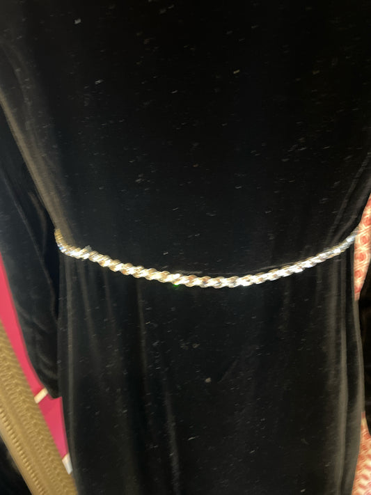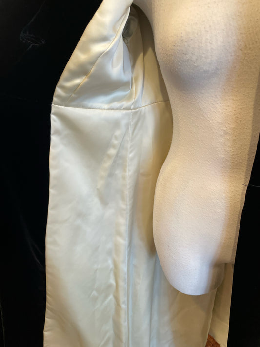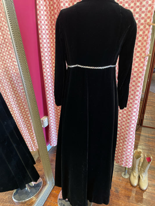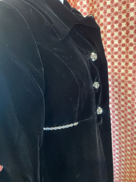 Vintage heavy champagne lined black velvet overdress/coat w/ 4 big crystal buttons and crystals at waist