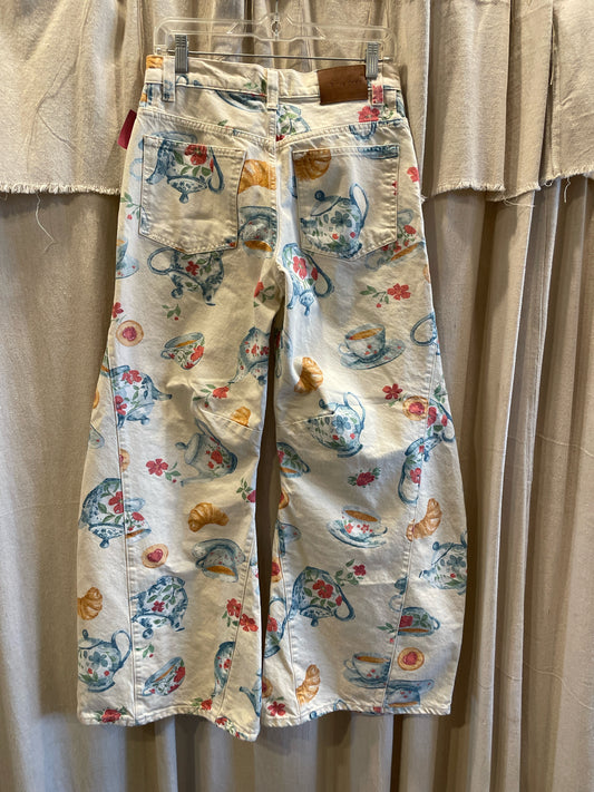 Tea-patterned high waisted super wide leg cream jeans